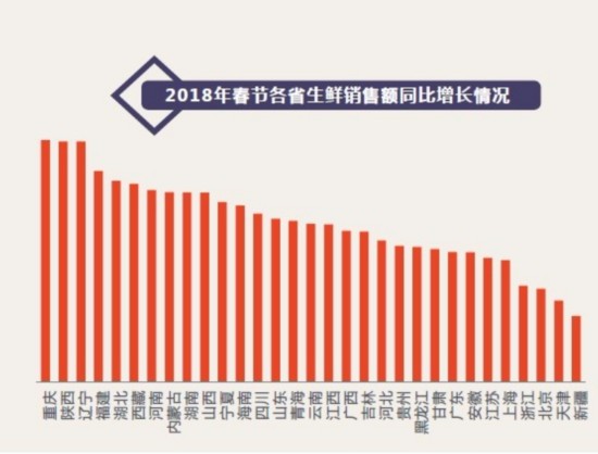 與2017年春節(jié)期間相比,2018年春節(jié)生鮮消費(fèi)同比增長(zhǎng)最快的省份包括重慶、陜西、遼寧、福建、湖北,其銷售額同比增長(zhǎng)均超過(guò)300%。(李程)