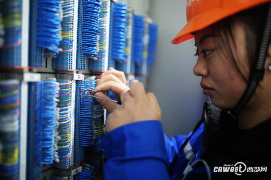 十多平米的設(shè)備房內(nèi)一片繁忙景象,四排信號機(jī)柜整齊排列,機(jī)柜里、地面上散落著很多線纜,每排柜子間都有一兩個(gè)忙碌的女工,她們神情專注,各色的線纜在手上飛舞。