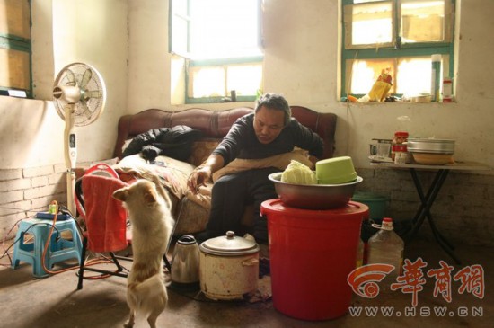3月26日上午華商報(bào)記者趕到時(shí),房前有幾戶(hù)居民正在洗衣服閑聊,在居民的指引下,華商報(bào)記者打開(kāi)桑福漢緊閉的家門(mén),家中兩個(gè)房間昏暗潮濕,47歲的他頭發(fā)斑白,在里屋靠窗位置沙發(fā)上坐著,面前就是鍋碗瓢盆、電飯煲、電熱水器等。看到陌生人進(jìn)來(lái),一條小狗一陣亂叫。