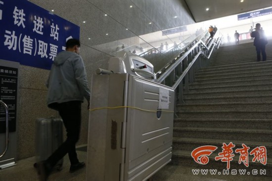 在地面一層,“親情服務(wù)崗”工作人員表示,如果出行的殘疾人是從地鐵口出來,根本不用乘升降機(jī),只需在負(fù)一層的高鐵售票窗口買好高鐵票,然后拿著票到鐵路到達(dá)口4的地方,找工作人員,他們就會將人直接帶到列車上。記者納悶的是,讓殘疾人的設(shè)施成了擺設(shè),而貼心服務(wù)為何又不公之于眾。 華商報記者 苗巧穎 攝影 張杰