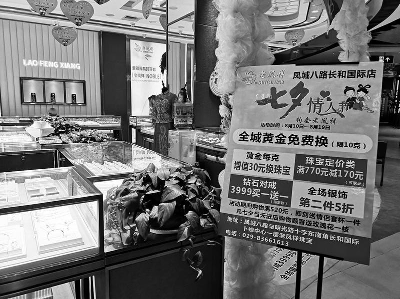 8月11日中午正逢周末,記者來(lái)到人氣極高的小寨賽格,在珠寶黃金專柜,發(fā)現(xiàn)很多珠寶品牌都趁機(jī)推出七夕活動(dòng),不少消費(fèi)者正在詢價(jià)。今年27歲的趙女士說(shuō),她和男友剛剛訂婚,準(zhǔn)備看看首飾,為婚禮準(zhǔn)備,這段時(shí)間恰好遇到七夕節(jié)活動(dòng),如果優(yōu)惠合適的話,她們就打算購(gòu)買(mǎi)了。