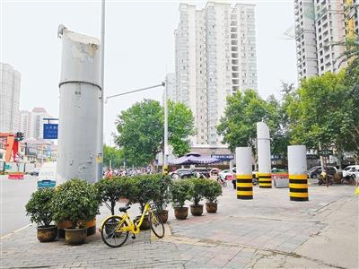 “太不美觀了,這些灰色的橋墩很難看,在人行道中間也擋路,友誼路和太白路分別是東西和南北方向的主干道,人流量也很大,上下班高峰行人多時,它們特別礙事。其實拆掉是最好的選擇,路面還能再開闊一點!崩钆空f,這些橋墩原本灰色的柱體表面漆皮紛紛脫落,斑駁不堪,一到夜間視線不好,經(jīng)常有行人走著走著就撞了上去,存在很大的安全隱患。因此,近期橋墩下部被刷上了黑黃相間的警示標(biāo)志。