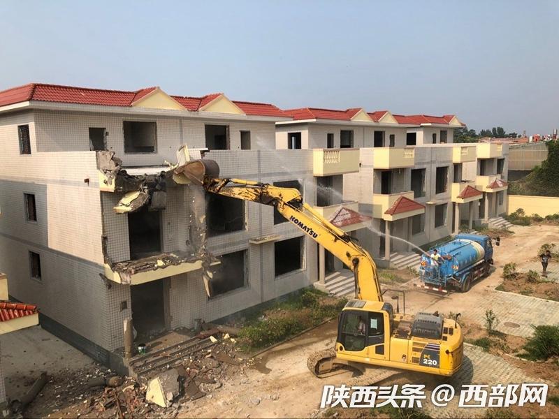 在灤鎮(zhèn)街道灃峪口村,一圈圍墻里的十棟別墅已經(jīng)拆掉了門(mén)窗,清理了內(nèi)部裝修,街道工作人員調(diào)集大型機(jī)械,集中人力,開(kāi)始全力拆除主體部分。