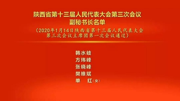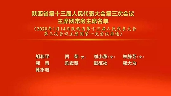 會(huì)議以按表決器方式,推選出由胡和平、賀榮、劉小燕、朱靜芝、郭青、梁宏賢、戴征社、郭大為、韓水岐組成的主席團(tuán)常務(wù)主席;決定了會(huì)議日程;決定了大會(huì)執(zhí)行主席分組名單;決定韓水岐、方瑋峰、張曉峰、樊維斌、單紅擔(dān)任大會(huì)副秘書長(zhǎng)。
