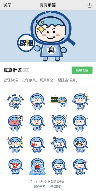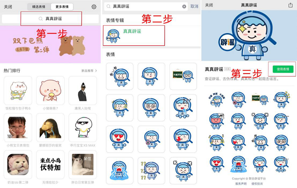 微信表情商店搜索“真真辟謠”,進(jìn)入表情專輯,點擊“使用表情”,即可使用。