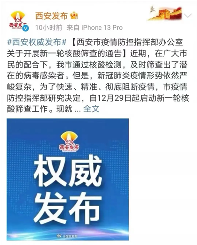 12月29日,西安市疫情防控指揮部辦公室發(fā)布關(guān)于開(kāi)展新一輪核酸篩查的通告,近期,在廣大市民的配合下,西安市通過(guò)核酸檢測(cè),及時(shí)篩查出了潛在的病毒感染者。但是,新冠肺炎疫情形勢(shì)依然嚴(yán)峻復(fù)雜,為了快速、精準(zhǔn)、徹底阻斷疫情,西安市疫情防控指揮部研究決定,自12月29日起啟動(dòng)新一輪核酸篩查工作。