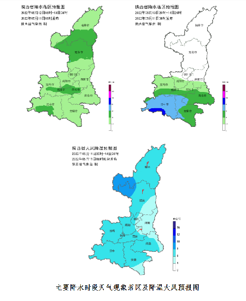 12-14日,陜西有降水降溫和大風(fēng)天氣。13日夜間至14日白天關(guān)中北部小雨,關(guān)中南部、陜南中到大雨,陜南南部局地暴雨。13日凌晨陜北北部局地最低氣溫可降至0℃左右,陜北西部局地最低氣溫可降至2℃左右。受低槽東移和西南渦影響,5月12日至14日我省自北向南有降水、降溫、大風(fēng)天氣過程。