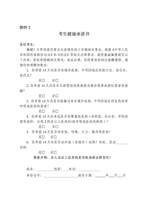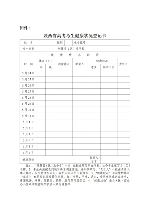 健康監(jiān)測。考生在高考前14天到高考結(jié)束應(yīng)進入靜態(tài)管理,堅持做到非必要不流動,不到人群流動性較大的場所活動,不接觸有疫情風(fēng)險的人員,做好每日體溫測量、記錄并進行健康狀況監(jiān)測,填寫《陜西省高考考生健康狀況登記卡》(附件1)和《考生健康承諾書》(附件2)?忌】等绯霈F(xiàn)異常狀況應(yīng)立即向?qū)W校和高考報名地考試機構(gòu)報告,不得謊報、瞞報。