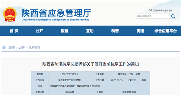 近期我省降水偏少,氣溫持續(xù)偏高,導(dǎo)致陜北北部、陜南東部、渭北出現(xiàn)輕到中度干旱,其中榆林、商洛、渭北局地出現(xiàn)嚴(yán)重干旱。后期降水仍將分布不均,旱情發(fā)展演變升級(jí)快,影響到工農(nóng)業(yè)生產(chǎn)安全。為做好當(dāng)前抗旱工作,現(xiàn)就有關(guān)要求通知如下: