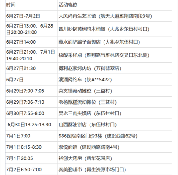 7月2日0-18時(shí),西安市新增1例本土確診病例,系重點(diǎn)人群核酸篩查中發(fā)現(xiàn)。6月19日、21日、24日、28日核酸檢測(cè)結(jié)果均為陰性,7月2日7時(shí)40分混檢結(jié)果異常,7月2日13時(shí),西安市疾病預(yù)防控制中心單檢結(jié)果陽(yáng)性,經(jīng)市級(jí)專家組診斷為確診病例(輕型),主要活動(dòng)軌跡如下:au7安康新聞網(wǎng)