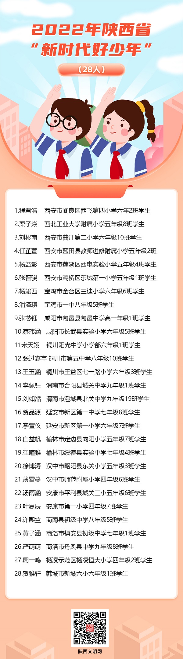 為深入貫徹落實習近平新時代中國特色社會主義思想,圍繞立德樹人根本任務,積極培育和踐行社會主義核心價值觀,幫助青少年“扣好人生第一粒扣子”,培養(yǎng)德智體美勞全面發(fā)展的社會主義建設者和接班人,進一步宣傳展示、學習弘揚新時代陜西少年的良好品德和時代風貌。今年3月至5月,省委文明辦、省教育廳、團省委、省婦聯(lián)在全省開展了 “尋找 學習 宣傳、爭做新時代好少年”活動。經(jīng)自下而上逐級推薦審核、網(wǎng)上學習評議、專家評審,擬確定程君浩等28名少年為2022年陜西省“新時代好少年”,現(xiàn)將名單予以公示,接受社會公眾監(jiān)督。