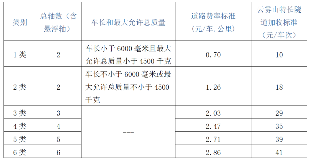 除國家規(guī)定免繳通行費(fèi)的車輛外,其他車輛均須按照《收費(fèi)公路車輛通行費(fèi)車型分類》(JT/T489-2019)及下列收費(fèi)標(biāo)準(zhǔn)繳納車輛通行費(fèi)。