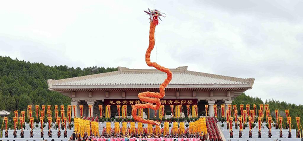 大風(fēng)泱泱,大潮滂滂,萬里山河,東風(fēng)浩蕩。在盛大的樂舞告祭中,一條長56米的“金色飛龍”從祭臺(tái)中心盤旋騰躍而起,承載著炎黃子孫對(duì)人文初祖無限崇敬與感恩之心、承載著實(shí)現(xiàn)中華民族偉大復(fù)興的中國夢,飛上云霄。