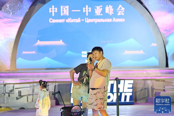 ↑5月15日,在西安大唐不夜城一處中國-中亞峰會活動展演舞臺前,來自山西的游客回看拍攝的視頻。新華社記者 宋為偉 攝nwC安康新聞網(wǎng)