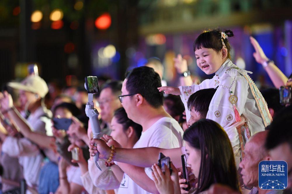 ↑5月15日,在西安大唐不夜城,身著古裝的小朋友騎在父親的肩上參與互動演出。新華社記者 宋為偉 攝nwC安康新聞網(wǎng)