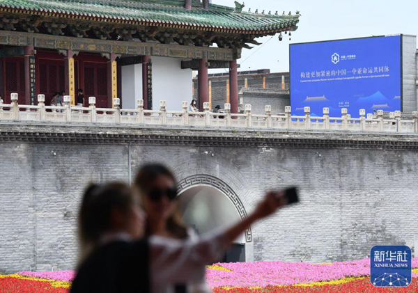 ↑5月16日,游客在西安市北大街上與中國-中亞峰會主題裝置合影。新華社記者 李一博 攝nwC安康新聞網(wǎng)