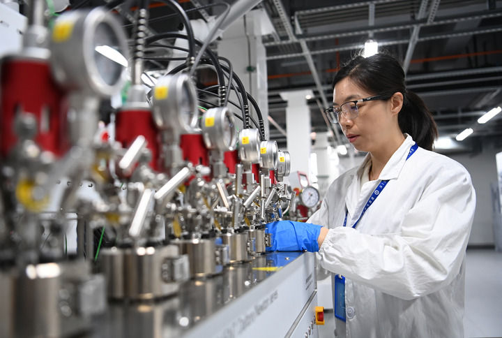 工作人員在榆林中科潔凈能源創(chuàng)新研究院工藝放大平臺實驗室制備催化劑小試樣品(2024年3月6日攝)。新華社記者 鄒競一 攝