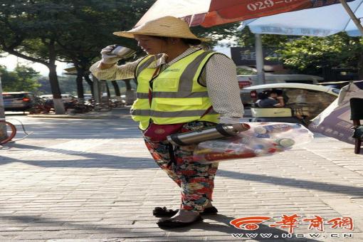 7月22日下午5時(shí)許,西安市南二環(huán)中段,一名保潔員戴著草帽在喝水,她手中還拎著撿到的飲料空瓶。 記者 趙彬 攝 因?yàn)樵跈z查中發(fā)現(xiàn)保潔路面煙頭較多,一名保潔員……