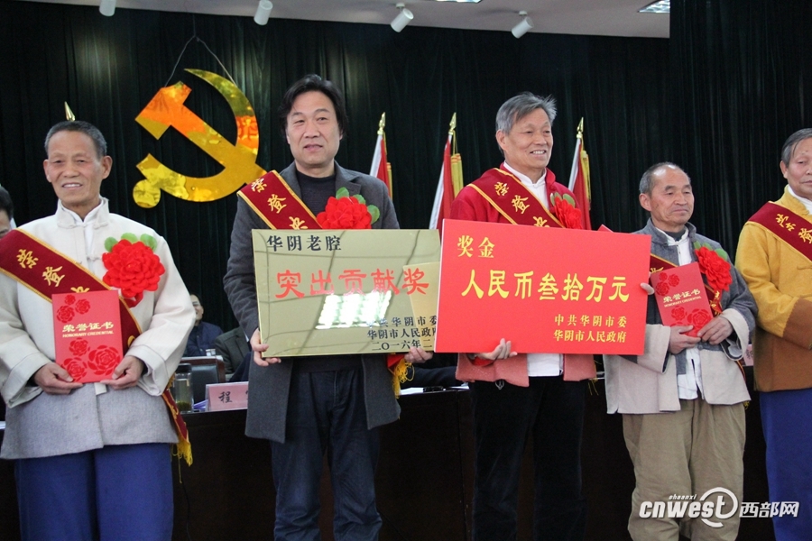 華陰市為“華陰老腔”頒發(fā)突出貢獻獎,為老腔藝人們頒發(fā)了榮譽證書。西部網(wǎng)訊(通訊員 楊雷雷 孟晟博) “華陰老腔”榮登2016年中央電視臺春節(jié)聯(lián)歡晚……