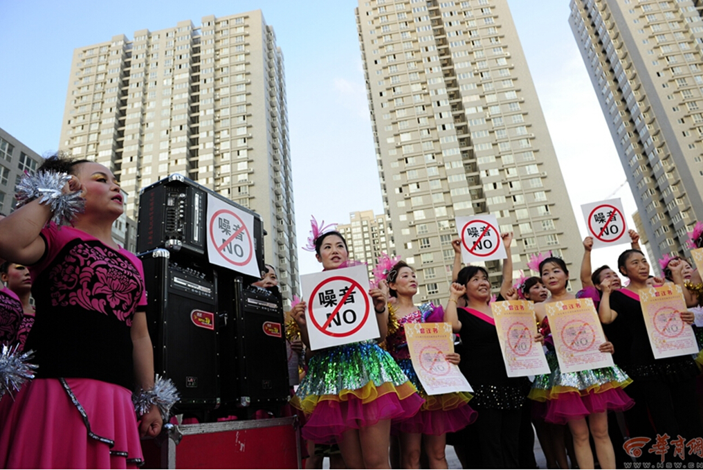 昨晚7時許,西安市未央?yún)^(qū)百花家園小區(qū),眾多廣場舞愛好者一起向廣場舞的音箱貼標(biāo)語,向噪音說“No”。跳廣場舞十多年的席云霞說:“我十分喜歡跳廣場舞,不……