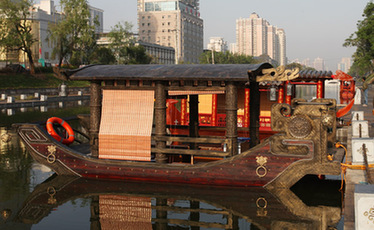 這艘仿古船有十七八米長(zhǎng),船內(nèi)裝飾精美。西部網(wǎng)訊(記者 魏永賢) 4月22日早晨,西安城墻南門(mén)西側(cè)護(hù)城河上停泊著7艘“秦、漢、唐”等不同主題的仿古游船。船舶古……
