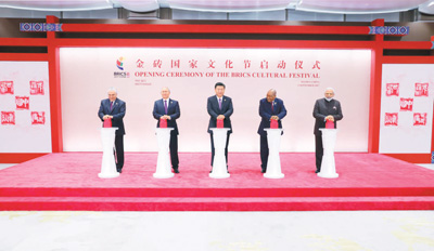同日,金磚國(guó)家領(lǐng)導(dǎo)人共同出席金磚國(guó)家文化節(jié)啟動(dòng)儀式暨文化圖片展。習(xí)近平和其他金磚國(guó)家領(lǐng)導(dǎo)人在各國(guó)印章柱上按下印章,對(duì)面屏幕上同時(shí)顯示出金磚國(guó)家中文國(guó)名篆刻印文,共同啟動(dòng)文化節(jié)開幕式。隨后,五國(guó)領(lǐng)導(dǎo)人共同參觀金磚國(guó)家文化圖片展,并觀看金磚國(guó)家首部合拍影片《時(shí)間去哪兒了》片花。