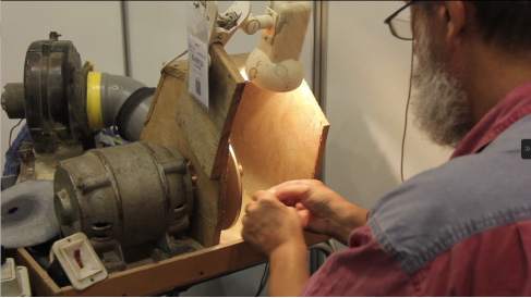 一位波蘭技師正用機(jī)器磨具磨制一塊琥珀原石。人民網(wǎng)記者 暨佩娟攝