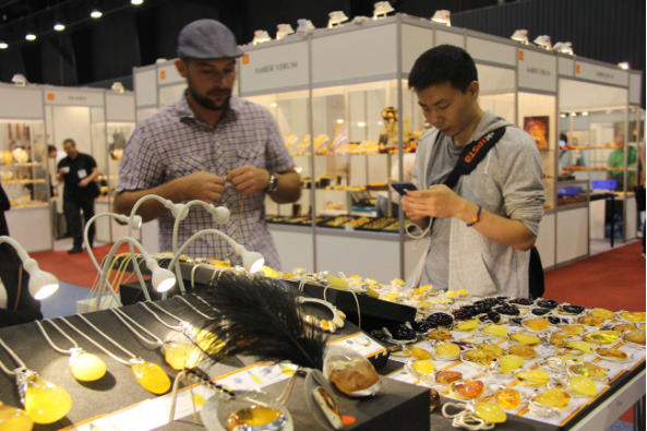 展區(qū)里,到處都能見到拿著小手電的中國買家在仔細(xì)品鑒琥珀珠寶,不少人拖著行李箱。很多中國進(jìn)貨商拿著手機(jī)對(duì)琥珀首飾一陣拍,只要微信那端客戶點(diǎn)頭,買賣馬上成交。展會(huì)上只收現(xiàn)金,不少中國買家把身上所有現(xiàn)金花光,只能相互“拆借”,或找當(dāng)?shù)厝A商用人民幣換歐元或茲羅提。