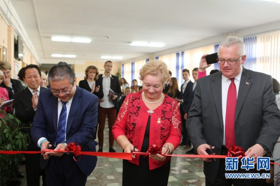 中國駐白俄羅斯大使館臨時代辦羅占輝(左)、白俄羅斯第12中學(xué)校長佩特魯莎(中)和白俄羅斯教育部長卡爾邊科共同為中國文化與文字中心剪彩。新華社記者魏忠杰攝