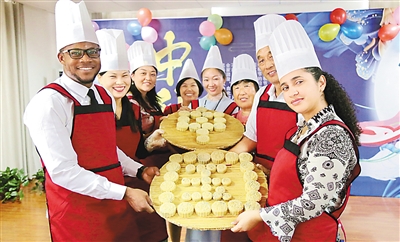 9月26日,山東省東營市東營區(qū)勝利街道勝景社區(qū)居民活動室里,山東科瑞控股集團的兩名外籍員工姆吉卡(右)、阿莫德(左)和社區(qū)居民在專業(yè)糕點師指導下學習制作月餅,迎接中國國慶和中秋佳節(jié)的到來。xB2安康新聞網