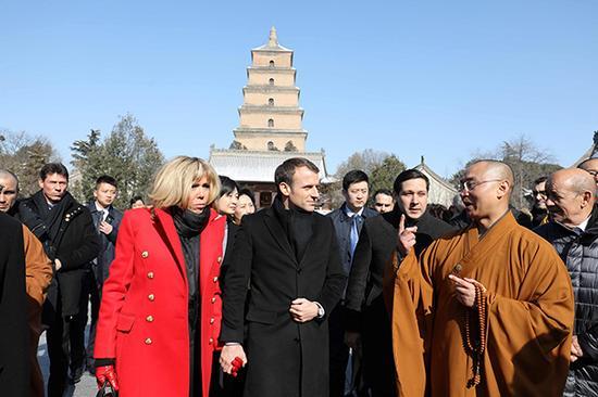 “參觀(guān)完兵馬俑后,馬克龍總統(tǒng)一行趕往大雁塔!标惓空f(shuō)。中國(guó)佛教協(xié)會(huì)副會(huì)長(zhǎng)、陜西省佛教協(xié)會(huì)會(huì)長(zhǎng)、大慈恩寺方丈增勤法師陪同馬克龍總統(tǒng)一行參觀(guān)了大雄寶殿,并登上大雁塔;監(jiān)院道宏法師為其介紹了大慈恩寺及大雁塔的歷史傳承和玄奘法師西行求法的精神。分析人士表示,馬克龍此次選擇大慈恩寺、大雁塔作為主要參觀(guān)點(diǎn),是因?yàn)槠渑c“絲綢之路”的密切關(guān)系,也表明了馬克龍希望傳遞出歐洲和中國(guó)將在“一帶一路”建設(shè)的框架內(nèi)加強(qiáng)合作的信號(hào)。
