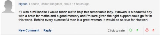 英國倫敦的網(wǎng)友bigben表示:“如果我能再有錢一些的話,我一定會(huì)幫助這位偉大的女士的。蔣昊文是個(gè)非常聰明的孩子,擅長數(shù)學(xué),過目不忘。他如果能夠有更多的幫助,必定能在世上有所作為。常言說,‘每個(gè)成功的男人背后都有個(gè)偉大的女人’,昊文背后偉大的女人就是他的奶奶!