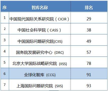 中國現(xiàn)代國際關(guān)系研究院、中國社會(huì)科學(xué)院等七個(gè)中國智庫上榜,其中,CCG上榜2017年全球頂級(jí)智庫百強(qiáng)榜單第91位,成為中國首個(gè)入選世界百強(qiáng)的社會(huì)智庫。