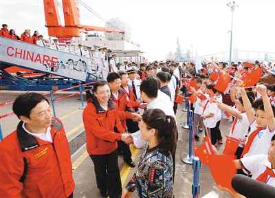 | 2017年10月10日,“雪龍”號(hào)圓滿完成第八次北極科考凱旋歸來(lái)。圖為科考隊(duì)員走下懸梯與前來(lái)迎接的人握手。 |