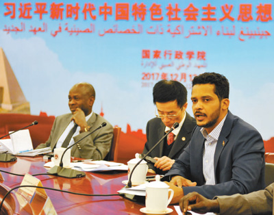 習(xí)近平新時(shí)代中國(guó)特色社會(huì)主義思想、人類(lèi)命運(yùn)共同體、反腐斗爭(zhēng)、精準(zhǔn)扶貧、“一帶一路”……2017年歲末,20位蘇丹政府部級(jí)官員來(lái)到中國(guó)參加國(guó)家行政學(xué)院的培訓(xùn)交流。黨的十九大規(guī)劃了中國(guó)從現(xiàn)在到本世紀(jì)中葉的發(fā)展藍(lán)圖,宣示了中方愿同各方推動(dòng)構(gòu)建人類(lèi)命運(yùn)共同體的真誠(chéng)愿望。蘇丹政府決策者們希望更加深入地理解中國(guó)和中國(guó)共產(chǎn)黨,學(xué)習(xí)借鑒中國(guó)經(jīng)驗(yàn)和中國(guó)智慧,解讀中國(guó)共產(chǎn)黨的“執(zhí)政密碼”