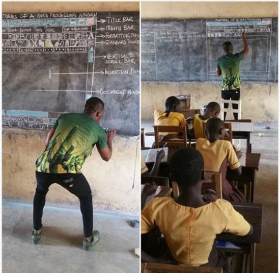 據(jù)英國《每日郵報》3月1日報道,近日,一位加納中學老師在臉書上分享的“獨門”教學照片帖子走紅網(wǎng)絡。據(jù)悉,由于他所任教的中學沒有電腦設備,所以他只能使用彩色粉筆不辭辛苦地將電腦屏幕的一個個頁面繪制到黑板上進行教學。他給學生在黑板上畫圖講解如何使用微軟Word的照片發(fā)出后,這位老師獲得了全球的贊譽。