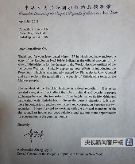 目前,這份書面道歉決議已經(jīng)正式呈交中國駐紐約總領(lǐng)事章啟月,得到了中方的書面回復(fù),并于當(dāng)?shù)貢r間4月5日轉(zhuǎn)呈陜西省文物交流中心。(央視記者 王萌 王風(fēng)華)