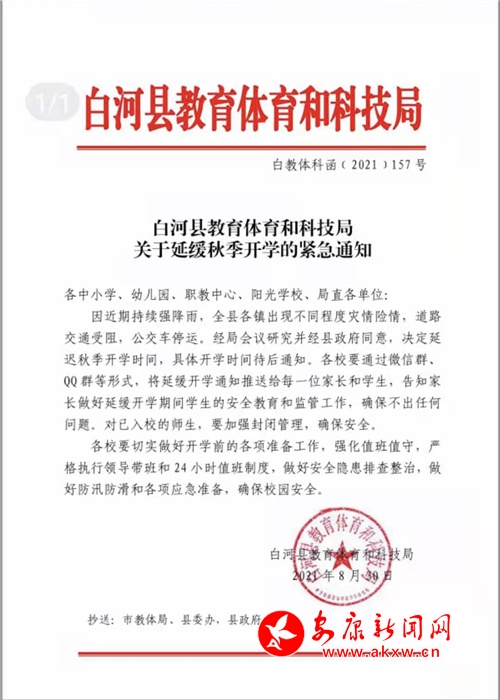 本網(wǎng)訊 因近期持續(xù)強(qiáng)降雨,白河全縣各鎮(zhèn)出現(xiàn)不同程度災(zāi)情險(xiǎn)情,道路交通受阻,公交車停運(yùn)。8月30日,白河縣教育體育和科技局發(fā)布《關(guān)于延緩秋季開(kāi)學(xué)的緊急通知》(以下簡(jiǎn)稱《通知》),決定延遲秋季開(kāi)學(xué)時(shí)間,具體開(kāi)學(xué)時(shí)間待后通知。YVV安康新聞網(wǎng)