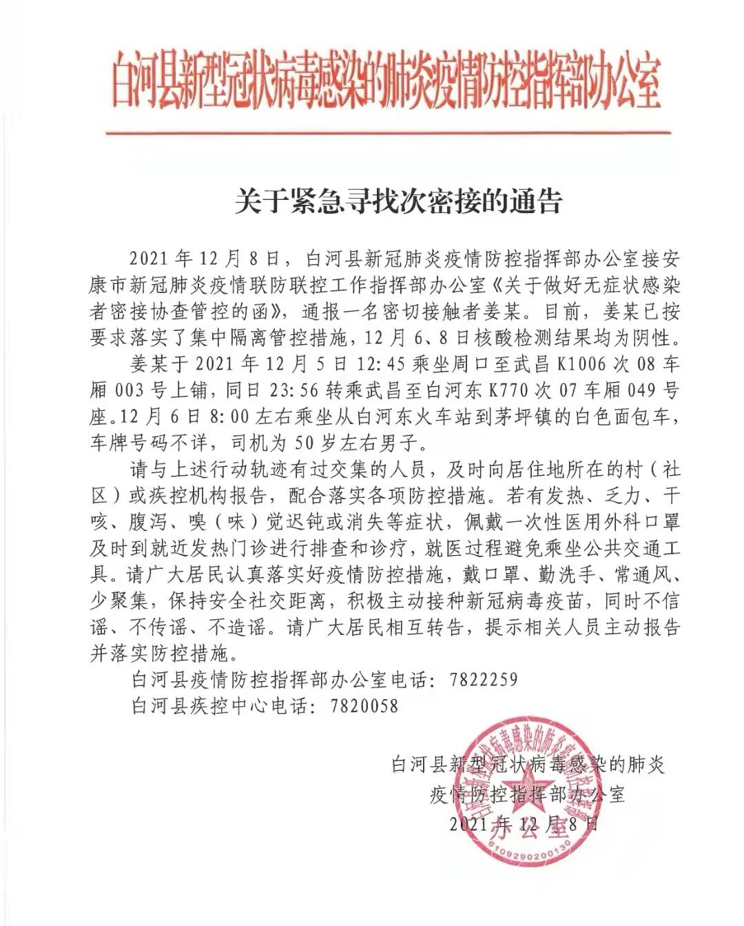 2021年12月8日,白河縣新冠肺炎疫情防控指揮部辦公室接安康市新冠肺炎疫情聯(lián)防聯(lián)控工作指揮部辦公室《關(guān)于做好無癥狀感染者密接協(xié)查管控的函》,通報(bào)一名密切接觸者姜某。目前,姜某已按要求落實(shí)了集中隔離管控措施,12月6、8日核酸檢測(cè)結(jié)果均為陰性。