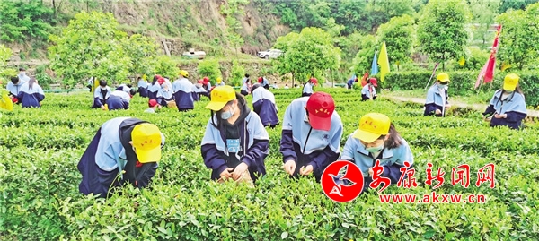 白河縣中廠初級(jí)中學(xué)學(xué)生在茅坪鎮(zhèn)五峰生態(tài)茶園采茶研學(xué)。 羅偉 攝