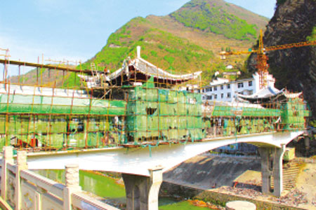 12月12日,工人們正在加緊建設(shè)景觀廊橋。據(jù)了解,白河縣白石河景觀廊橋工程于去年11月開工建設(shè),總投資500萬元,橋長90米,寬7.5米。 吳 磊 攝……