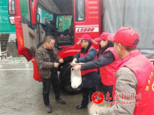 2月21日上午,降雪導(dǎo)致十天高速道路封閉,部分司機(jī)和乘客滯留在白河服務(wù)區(qū),陜西交控集團(tuán)白泉分公司白河管理所組織青年志愿者為滯留司乘送去饅頭、雞蛋、姜湯等食……