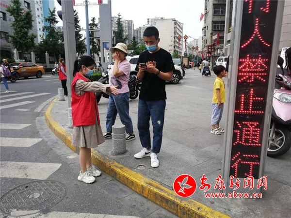 “你好,請(qǐng)走人行道”“綠燈亮了,再過(guò)斑馬線”……戴著口罩,統(tǒng)一身穿紅色馬甲的文明勸導(dǎo)員,在十字路口溫馨地對(duì)過(guò)往行人勸導(dǎo)著。