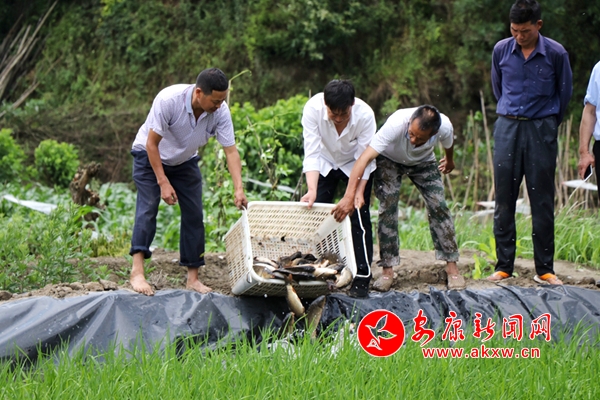看到鄰村嘗到了甜頭,瓦房村今年也發(fā)展了52畝稻魚,并成立了瓦房村集體股份經(jīng)濟合作社,吸納18戶貧困戶加入。當天,該村組織村民投放魚苗,并與公司簽訂了稻魚收購協(xié)議,預計第一批稻田生態(tài)魚10月份可以上市。
