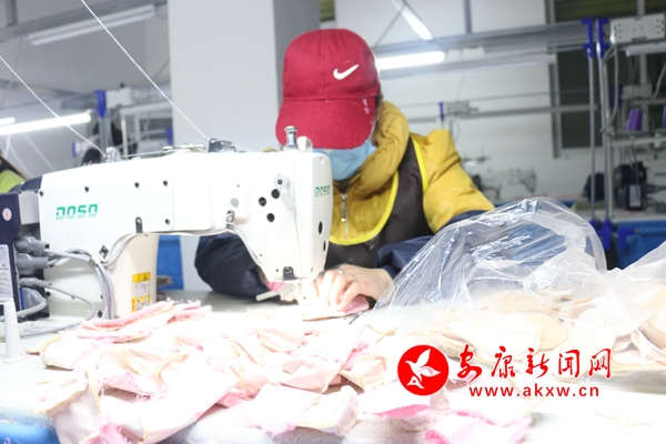 劉家溝社區(qū)工廠里,婦女們正嫻熟地踩著縫紉機(jī),在這里我們見到了同住包河村的貧困戶胡興英,據(jù)社區(qū)工廠經(jīng)理介紹,她是工廠里手腳最快、出勤率最高的人。“廠子剛辦起來她就來了,心靈手巧,一點(diǎn)不比年輕人差。”