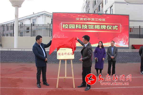 馬曉寧校長首先向與會人員介紹了校園科技館及校區(qū)開展科技教育的基本情況。隨后,區(qū)科協(xié)主席李森乾、漢濱初中校長徐平共同為濱江校區(qū)科技館揭牌,李主席還代表區(qū)科協(xié)向濱江校區(qū)捐贈了科技創(chuàng)新大賽優(yōu)秀作品書籍。