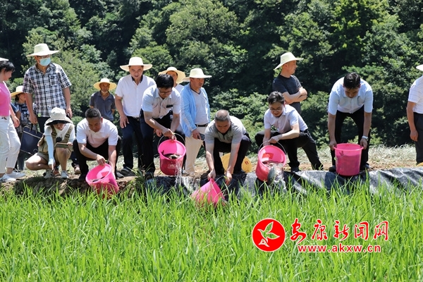 本網(wǎng)訊(通訊員 周濬)“稻在水中長,魚在稻下游。”6月22日,位于安康市漢濱區(qū)北山的大河鎮(zhèn)流芳村,村民在稻田里投放魚苗,一幅秧苗青、魚兒歡的田園畫卷鋪展開來。