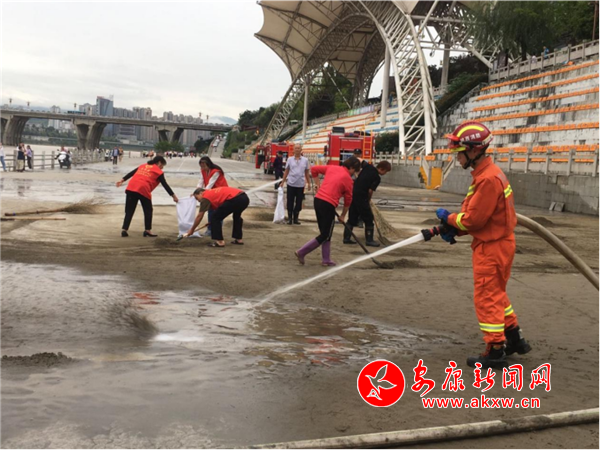 本網(wǎng)訊(通訊員 熊彬彬 李汶澤)日前,安康各縣區(qū)普降大雨,漢江水位持續(xù)上漲,城區(qū)沿江公園、步道等多處被淹。隨著水位回落,清理淤泥工作迫在眉睫。為盡快清理龍舟文化園臨江廣場上沉積的大量淤泥,避免淤泥干結(jié)加大清理難度,老城街道辦事處漢江辦、西關(guān)社區(qū)隨即聯(lián)系到漢濱區(qū)消防大隊協(xié)商開展清淤活動,漢濱區(qū)消防大隊表示志愿進行淤泥清理行動,盡快恢復(fù)環(huán)境衛(wèi)生,及早還廣大市民干凈整潔的娛樂生活環(huán)境。neP安康新聞網(wǎng)