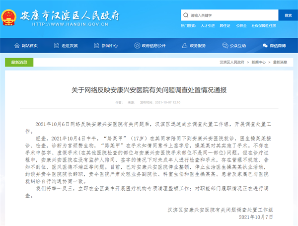 2021年10月6日網(wǎng)絡(luò)反映安康興安醫(yī)院有關(guān)問題后,漢濱區(qū)迅速成立調(diào)查處置工作組,開展調(diào)查處置工作。