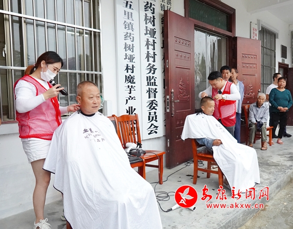 7月19日一大早,五里鎮(zhèn)藥樹埡村熱鬧非凡。很多村民陸續(xù)趕到村委會,排隊(duì)理發(fā)。“我平常理發(fā)要去鎮(zhèn)上,來回一趟得兩三個小時,還要花二三十的車費(fèi)。這次有人來免費(fèi)給我們理發(fā),真開心。”剛理完發(fā)的曹德秀阿姨高興地說。